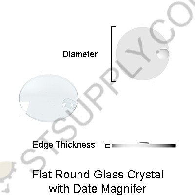 These flat round mineral glass crystals come in various thickness and diameters and with a date magnifier located at the 3 o'clock position. They are round in shape and flat on the bottom and top. The edges are polished. These crystals can either be glued or pressure fitted.